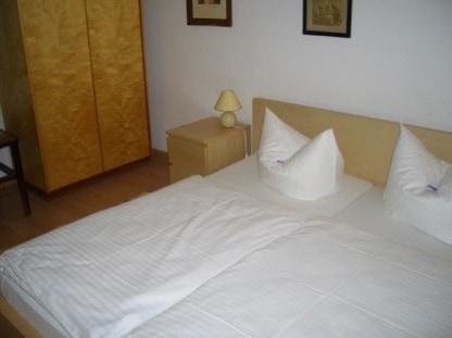 Das kleinere Schlafzimmer (14 qm) ist ebenfalls mit einem großen Doppelbett versehen. Auch hier befindet sich ein Kleiderschrank.