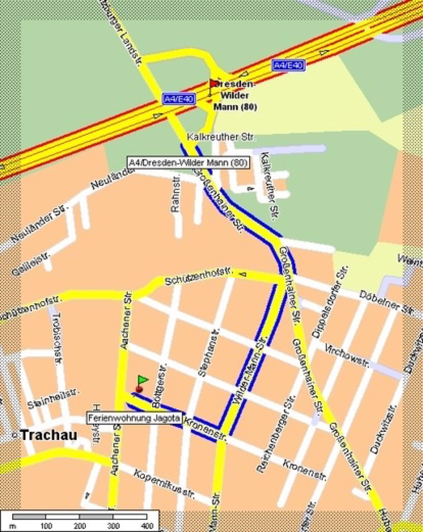 Unsere Ferienwohnungen sind im Nordwesten Dresdens gelegen, nur 3 Minuten von der Autobahnabfahrt "Dresden-Wilder Mann" entfernt.