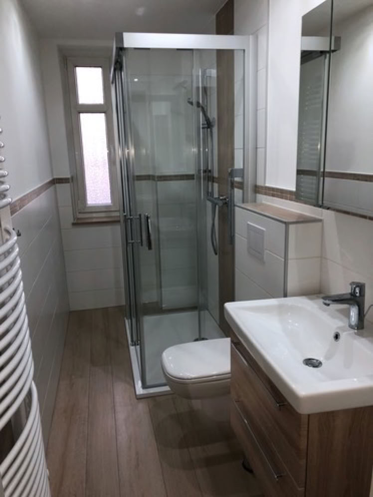 Zum gefliesten Badezimmer gehört neben dem WC und dem Waschbecken eine modere Dusche.